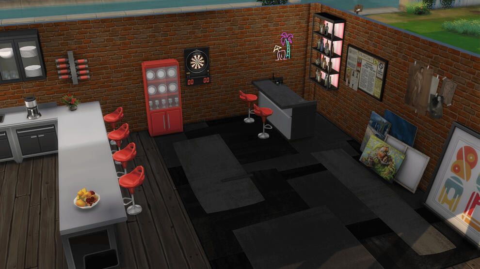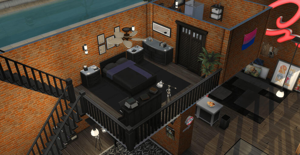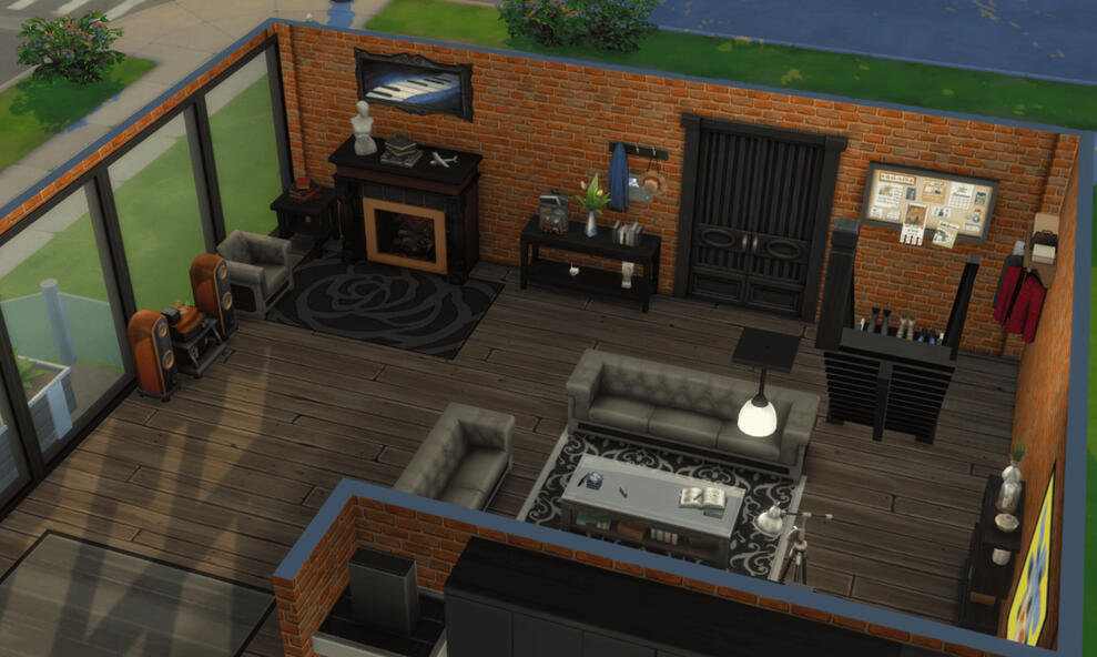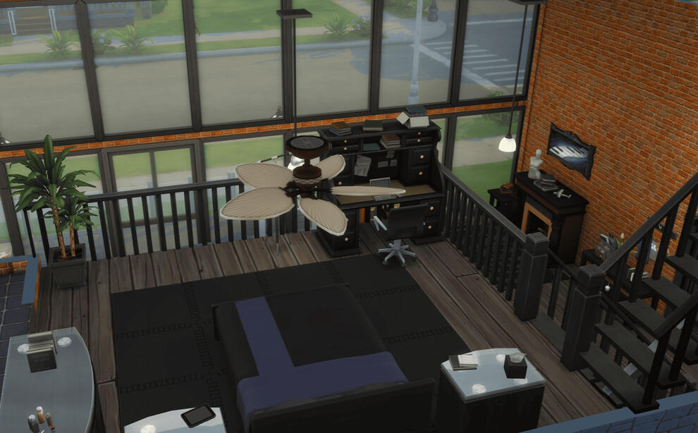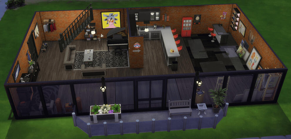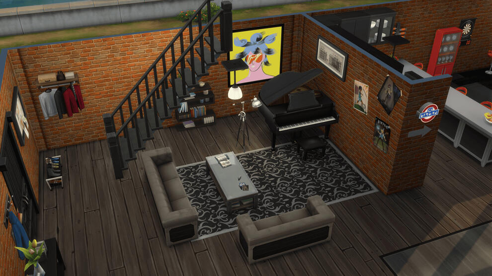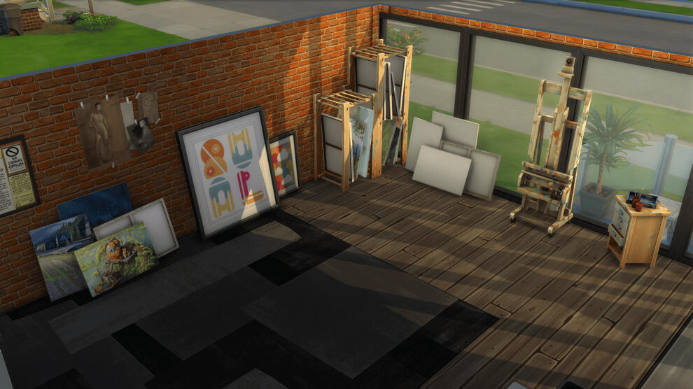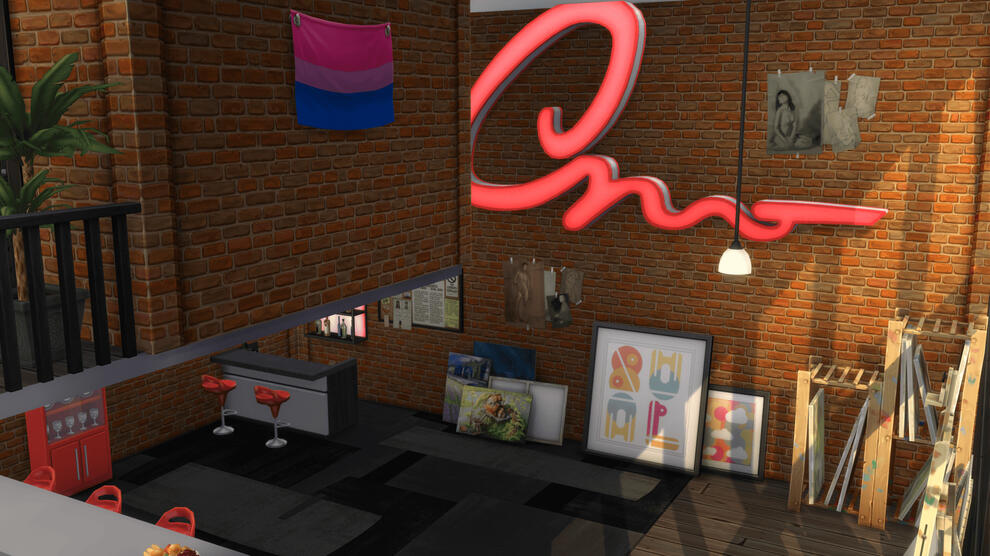 Espacio abierto de techos muy altos y una pared formada por un gran ventanal donde se encuentra el recibidor y una pequeña sala de estar con sofás, una esquina dedicada a la lectura y a su colección de vinilos, junto a una chimenea. En la esquina contraria se encuentra el área más caótica, donde tiene todos los lienzos (algunos de ellos destrozados fruto de sus incontrolables ataques de ira), además de una pequeña zona con un mini-bar y una diana para jugar a los dardos.